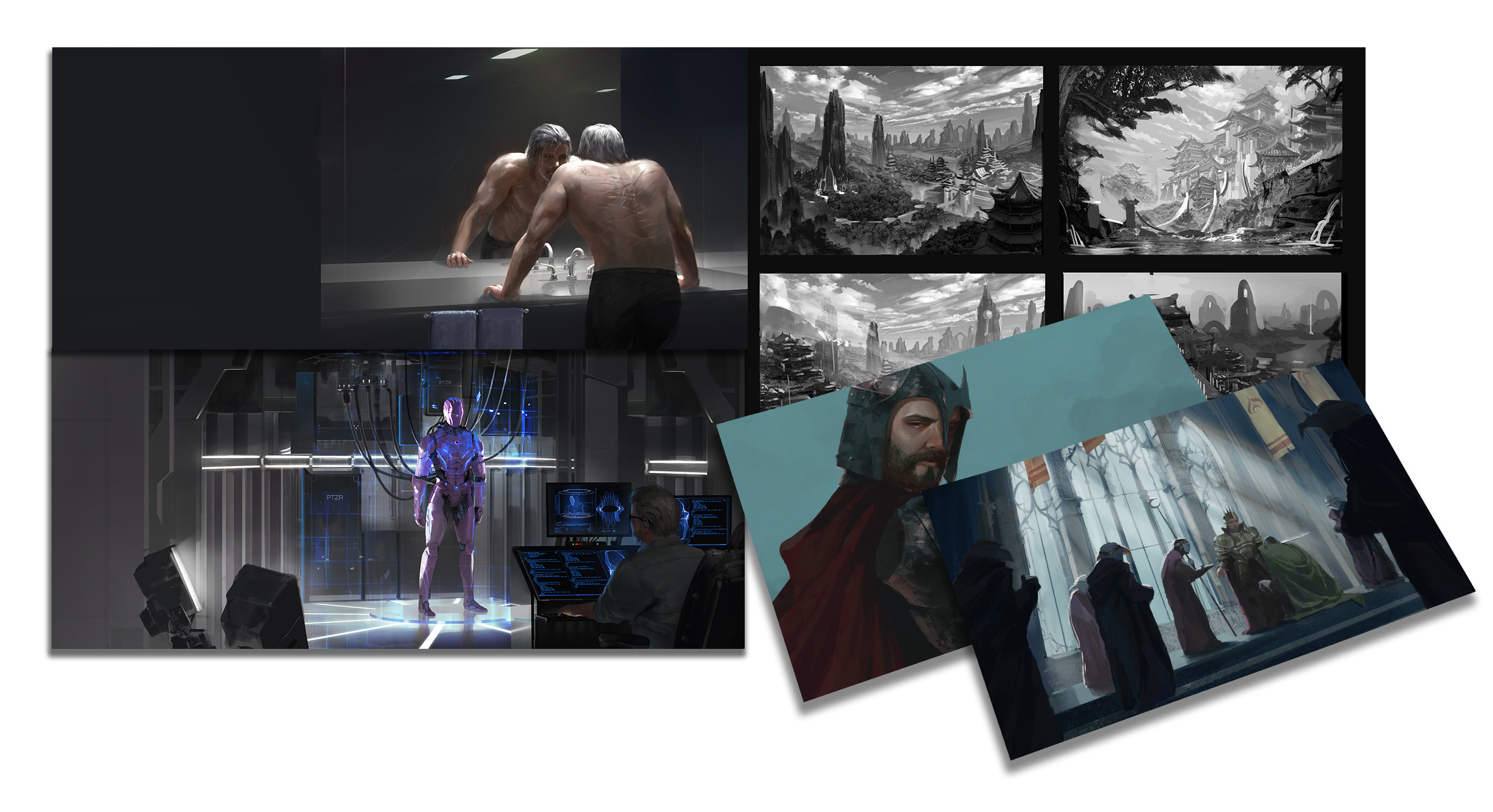 Concept art for environments, characters, and key moments.